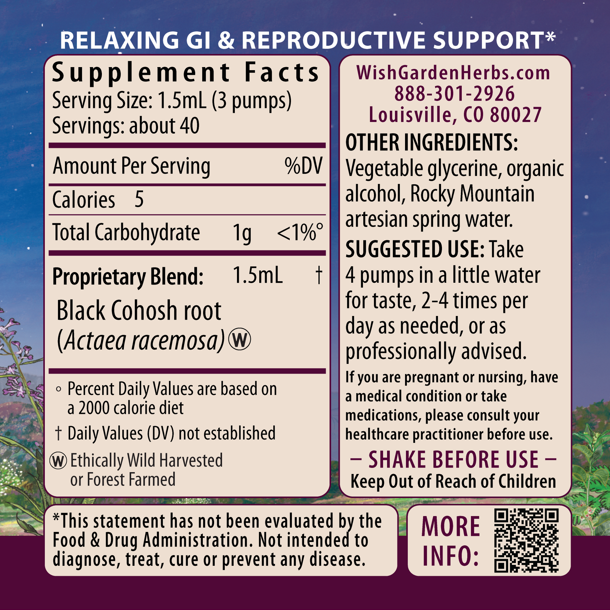 - Black Cohosh root: Actaea racemosa is commonly used to ease muscle discomfort, irritability, sleep disturbances and supports the balance of hormones. It supports a healthy inflammatory response and helps calm and relax the muscles throughout the body and joints, and is most often used to ease cramps and menopausal discomforts such as night sweats, hot flashes, irritability, and sleep disturbances.