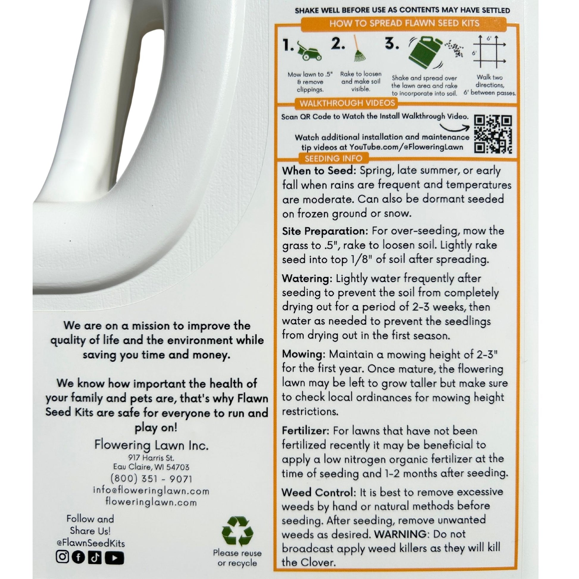 Here at Flowering Lawn, we are on a mission to improve the quality of life and the environment, starting with lawns! By making the easy switch to Flawn Seed, you will experience many benefits like reduced mowing, fertilizing & watering - saving you time and money. Flowering lawns support beneficial pollinating insects. Flowering lawns also capture and store more carbon making your property greener. Our Flowering Lawn Kit seeds are easy to establish and can be seeded during any season! If you seed your lawn in late fall or winter, wait until the ground is frozen or sprinkle over fresh snow. If seeding in spring, wait until the ground thaws and soil temperatures are around 55 degrees. Avoid seeding before hot and dry periods to prevent soil from completely drying out during germination. Our Flawn Seed Flowering Lawn Kit seeds is designed to be over-seeded into existing grass lawn areas to create about half grass and half clover. If you are starting with bare soil, add 2-4 lbs of grass seed per 1,000 sqft. If you desire to have only clover and no grass, increase your seeding rates. Caring for a Flowering Lawn - Continue to mow your lawn regularly for the first season to prevent the grass from overtaking the seedlings. Regular mowing at 2-4” is necessary to maintain smaller leaves. This will result in fewer flower blooms. Without regular mowing, the clovers will produce larger leaves and produce more flower blooms. Watering through hot and dry periods may also be necessary. Packaging is recyclable.