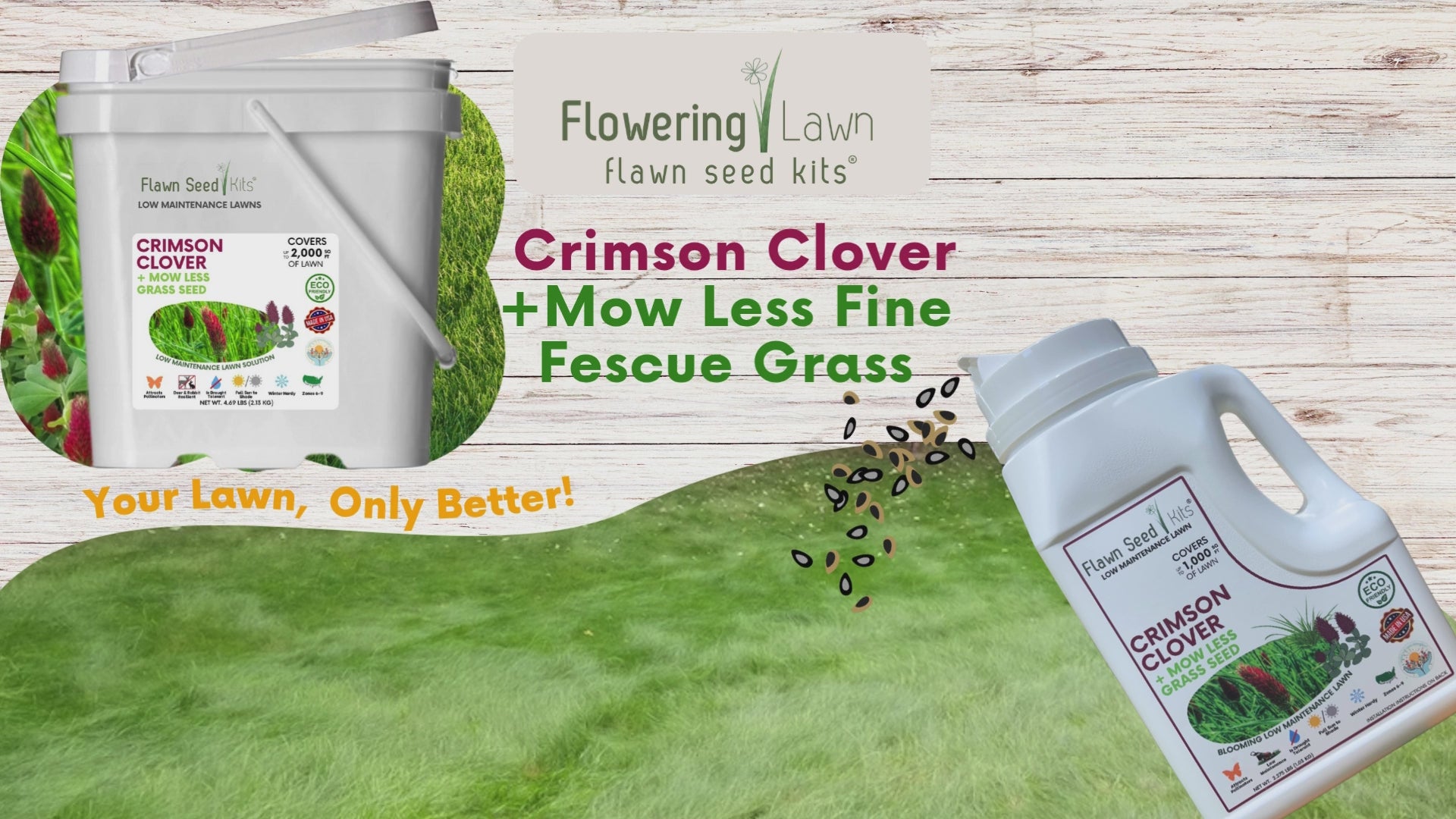 Non-GMO Crimson Clover seed mixed with Mow Less Fine Fescue grass seed blend available in either a kraft pouch, easy spread shaker jug, or bulk size pails.