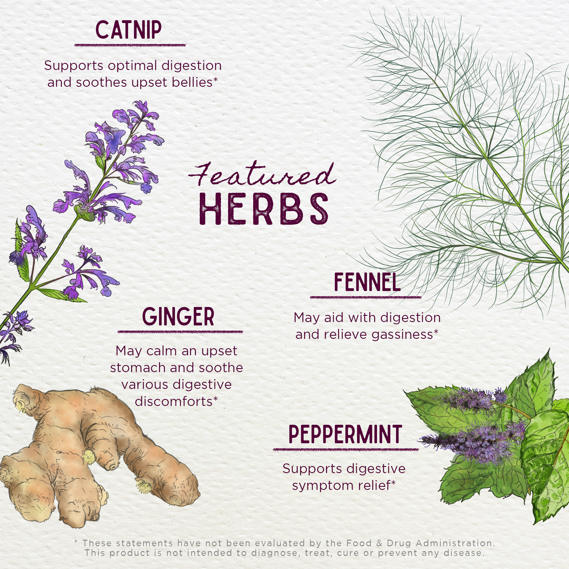 - Catnip aerials: Nepeta cataria is most well known for being a favorite of cats, but it is beneficial for humans too. It is a member of the mint family, and like other mints, may help support optimal digestion and soothe digestive comfort.
