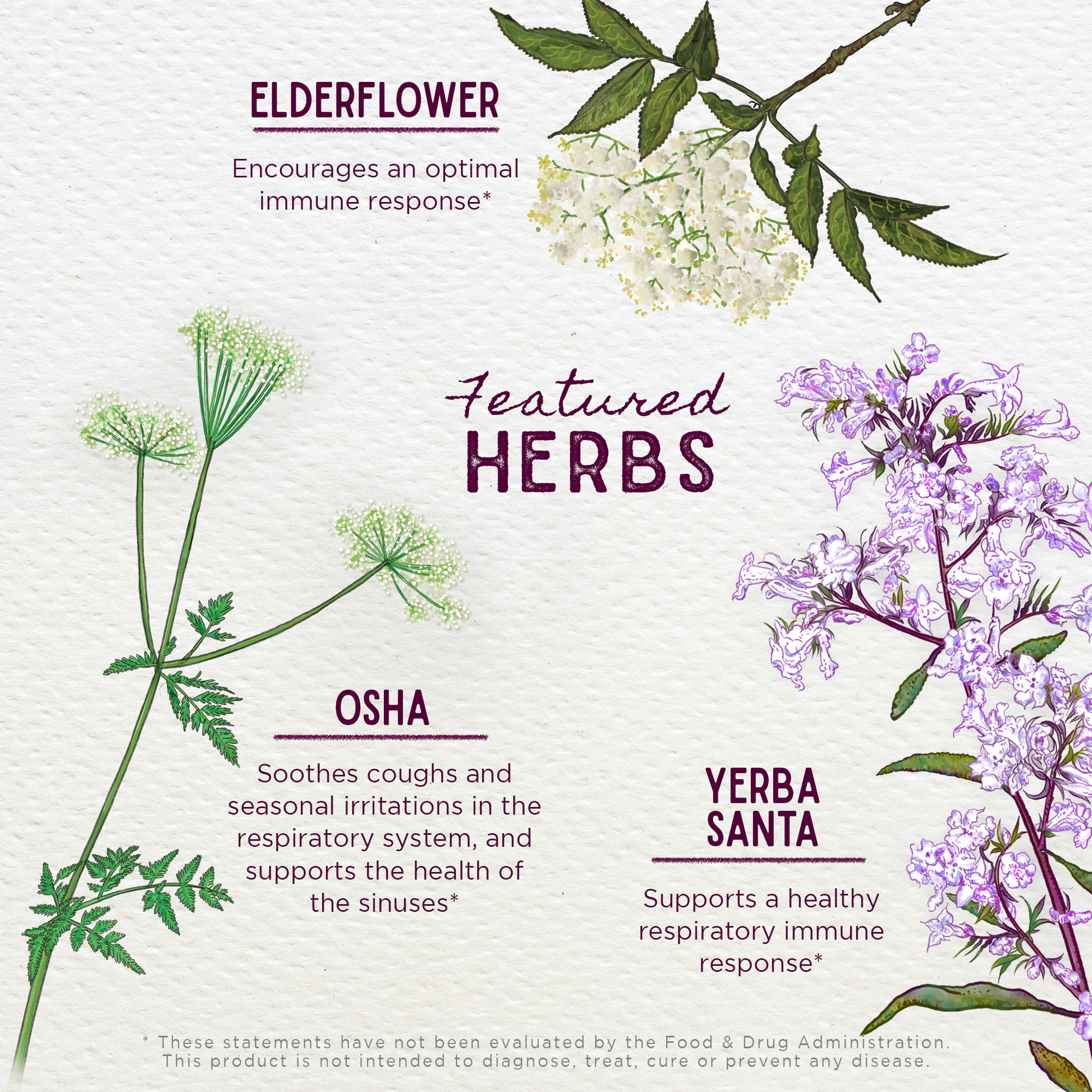 Organic Echinacea purpurea root (Echinacea purpurea), Yerba Santa leaf (Eriodictyon spp. (californicum, angustifolium, crassifolium, trichocalyx)), Hawthorn berry (Crataegus spp.), Elderflower (Sambucus nigra), organic Calendula flower (Calendula officinalis), organic Osha root (Ligisticum Porteri), vegetable glycerine, Rocky Mountain artesian spring water & organic gluten-free alcohol.