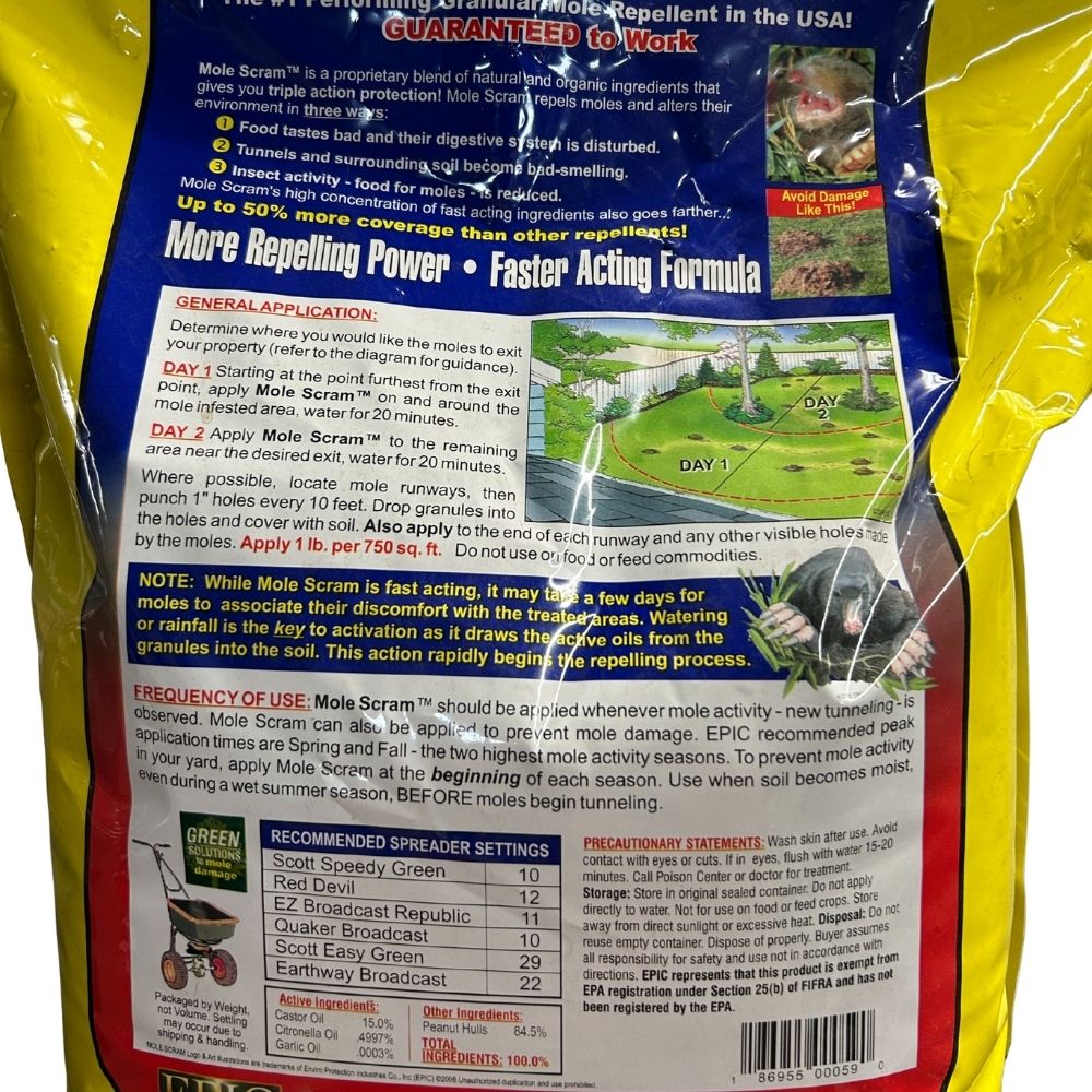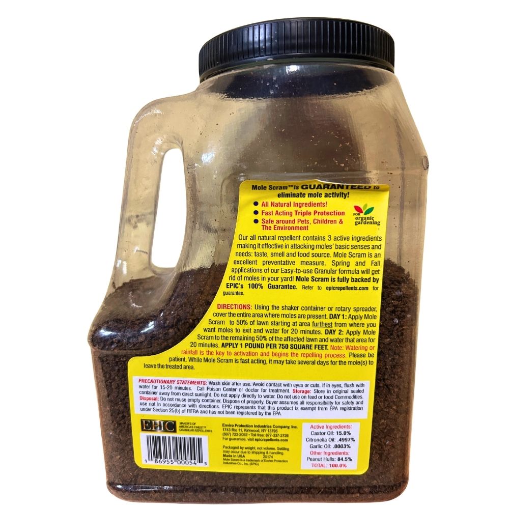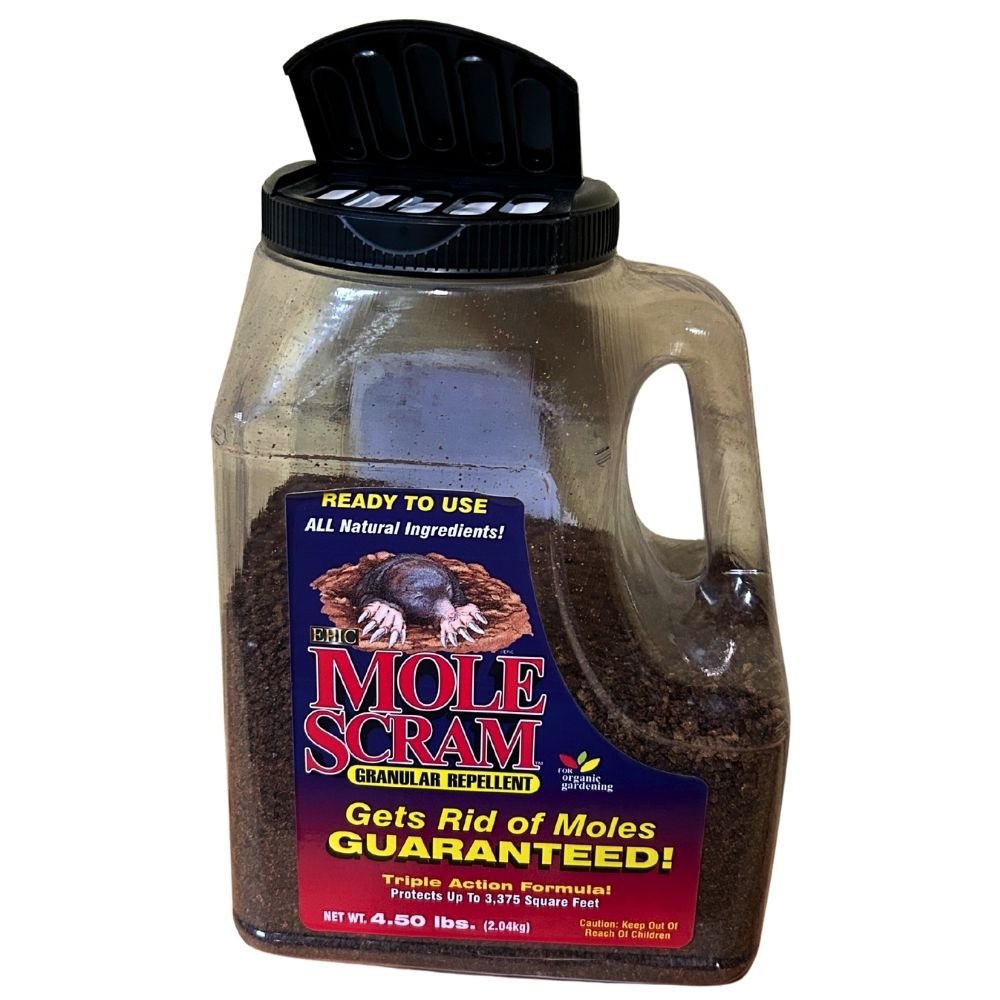 Dual-action granular mole repellent specially formulated to drive moles away from your lawn and garden. Works by combining taste that moles dislike as well as strong odor that is very mile to people but offensive to moles. Does not harm or kill moles. Mole Scram won't harm you or the environment. Safe for dogs and cats.