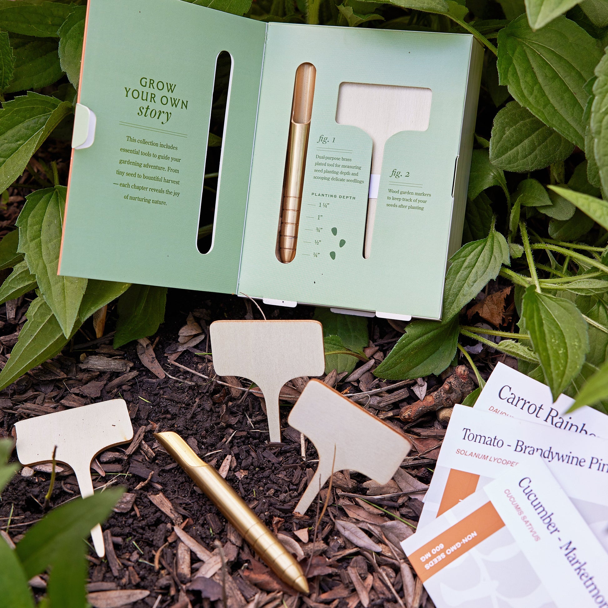 Embark on an epicurean tale. Whether in your backyard, raised bed or balcony; there’s a story waiting to unfold. Sets contain three thoughtfully sourced seed packets, three bamboo garden markers, and a dual-use brass dibber tool. One side of the dibber ensures precise and efficient planting, while the other gently scoops and moves delicate seedlings.