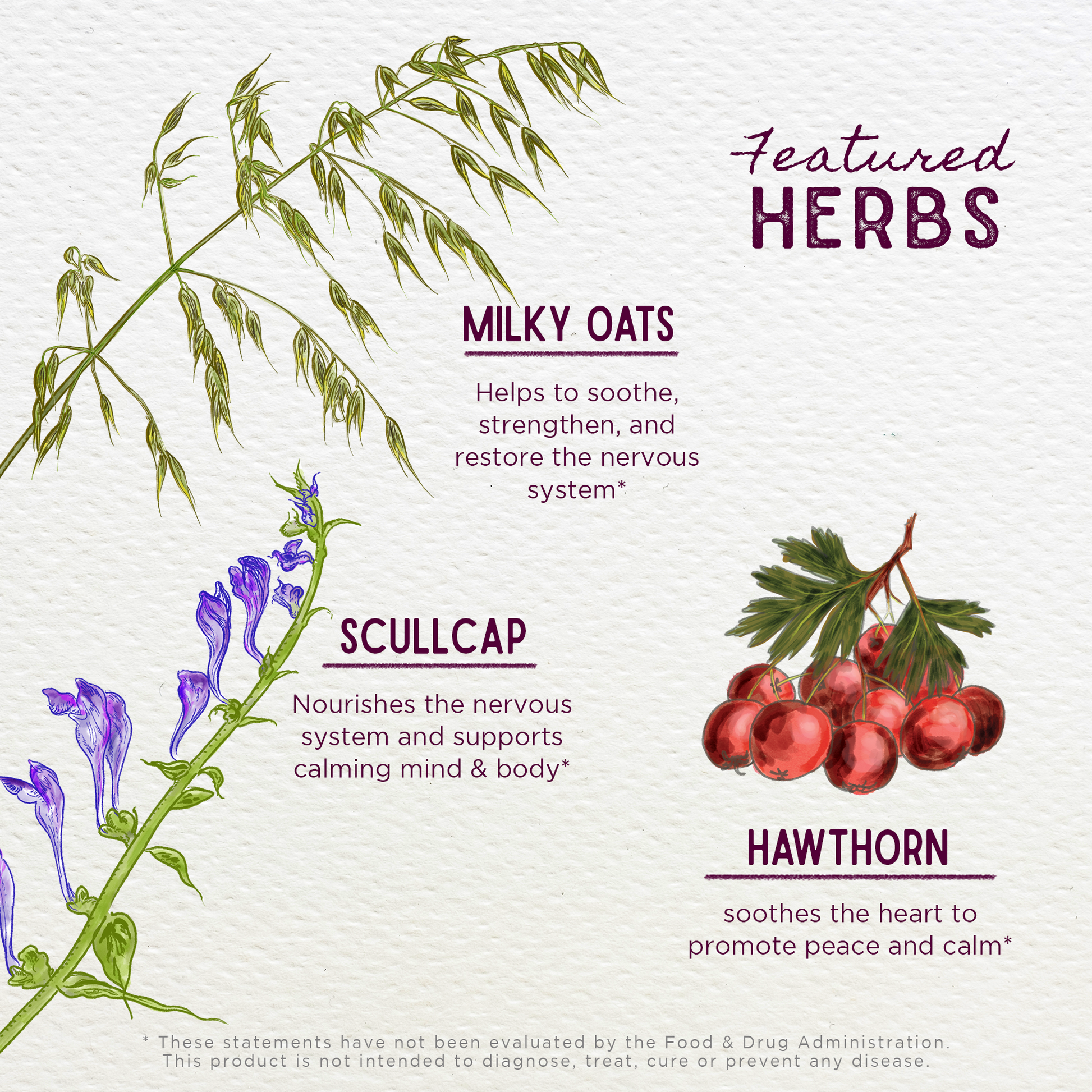 Organic Milky Oat tops (Avena sativa), organic Passionflower aerials (Passiflora incarnata), Hawthorn berry (Crataegus spp.), organic Linden leaf and flower (Tilia europea, T. cordata, T. spp.), organic Scullcap aerials (Scutellaria lateriflora), vegetable glycerine, Rocky Mountain artesian spring water & organic gluten-free alcohol.