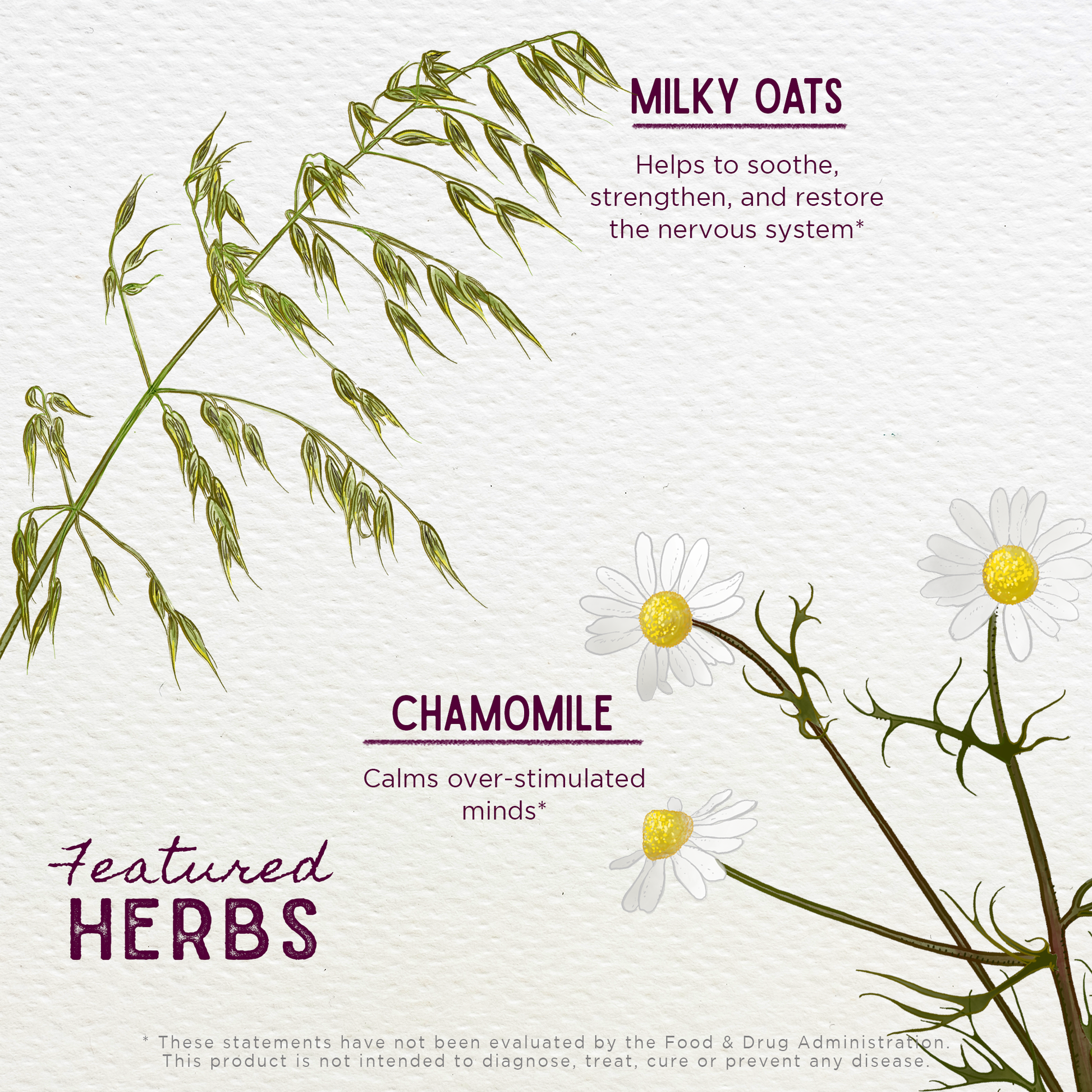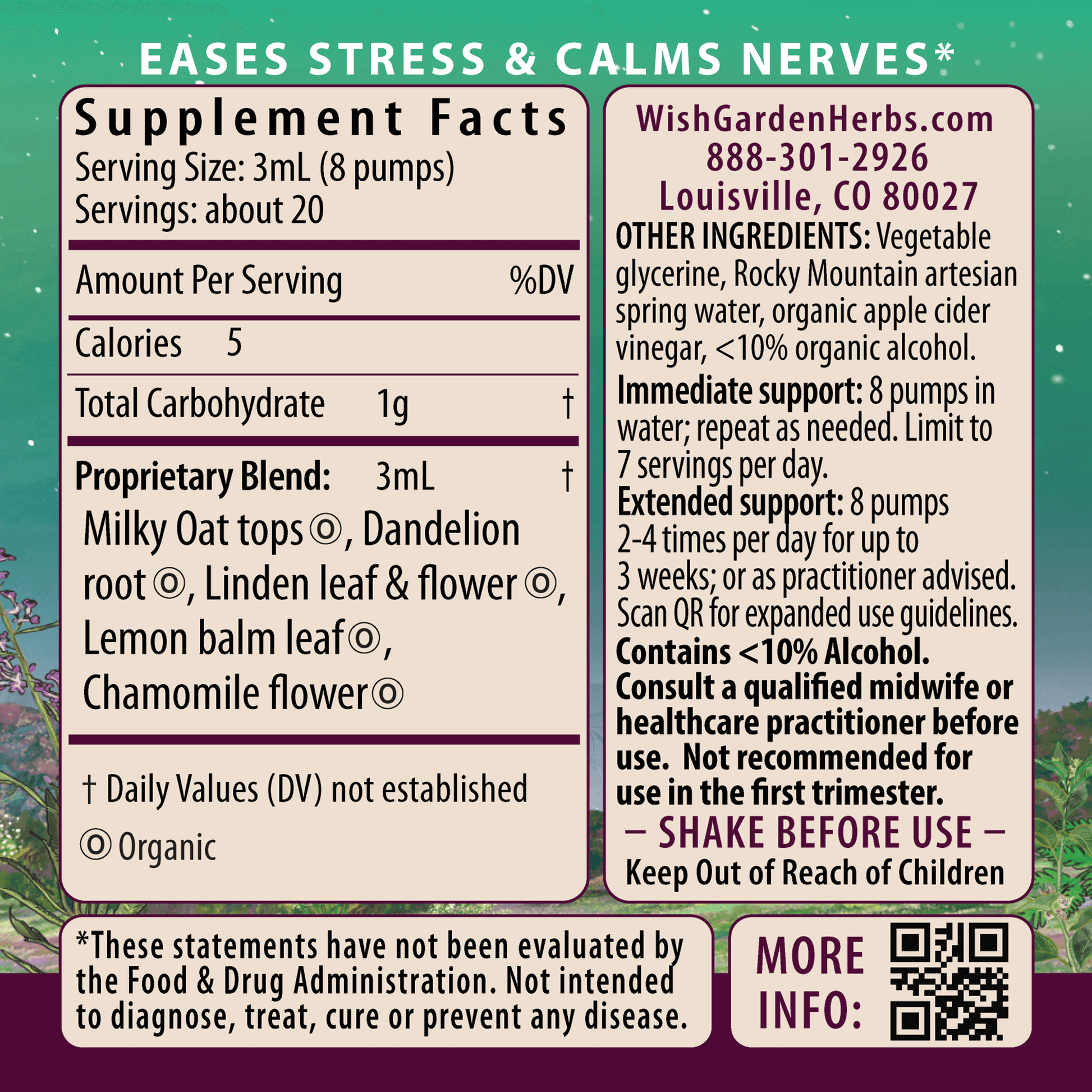 Organic Milky Oat tops (Avena sativa), organic Dandelion root (Taraxacum officinale), organic Linden leaf and flower (Tilia europea, T. cordata, T. spp.), organic Lemon Balm leaf (Melissa officinalis), organic Chamomile flower (Matricaria recutita, M. chamomilla), vegetable glycerine, Rocky Mountain artesian spring water, organic apple cider vinegar & organic gluten-free alcohol.